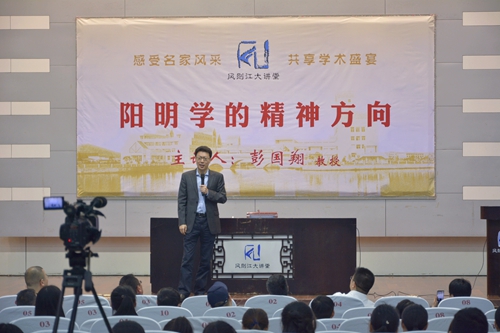 4月19日晚,浙江大学求是特聘教授彭国翔做客风则江大讲堂,作题为《阳明学的精神方向》的讲座。彭国翔用形象生动的语言讲述了阳明学的精神发展方向,指明了“良知”和“致良知”的理念,阐明了“万物一体”等观念。