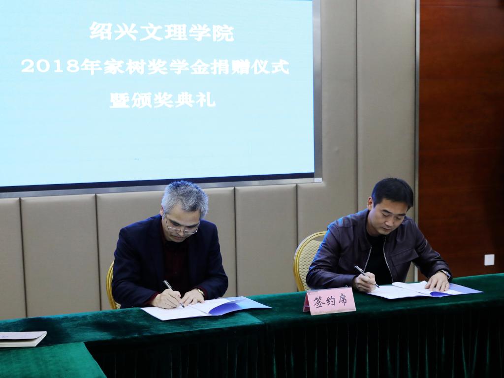 上海家树建筑工程有限公司副总经理陈军与校教育基金会相关人员签订捐赠仪式。唐和祥代表学校接受邹小锋捐赠并向上海家树建筑工程有限公司颁发捐赠证书。陈均土宣读表彰文件。上海家树建筑工程有限公司相关负责人为“家树”奖学金获得者颁发获奖证书。