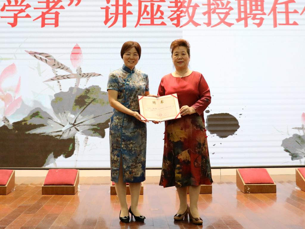 郝敬习为姜小鹰教授颁发“鉴湖学者”聘书。