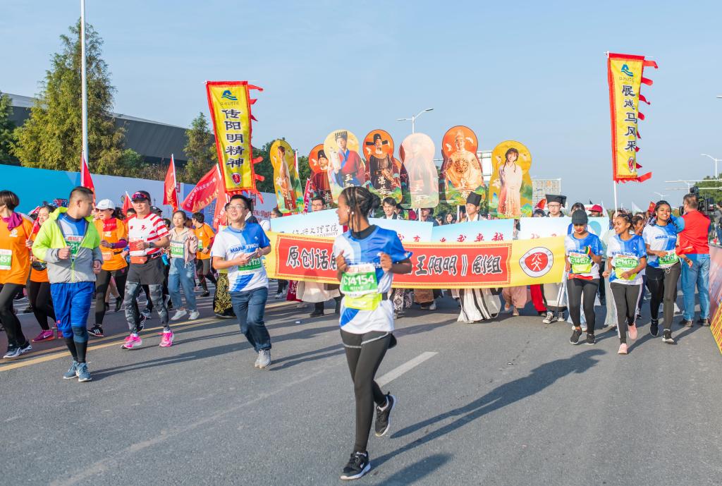 我校方阵由28个国家和地区的80名国际留学生、《千古一圣王阳明》话剧成员20人、教师代表40人组成。早上5点40分,我校师生就身着统一服装集体前往比赛起点——绍兴市奥体中心,7点30分,在校旗的引领下,我校运动员精神饱满,沿着风景秀丽的解放大道奋力开跑,在锻炼身心的同时,还尽情领略了古城绍兴的旖旎风光。