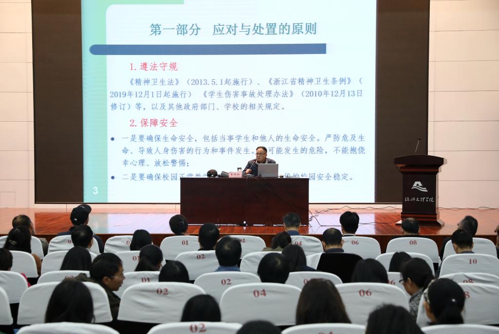 会议邀请浙江工商大学心理中心主任王晓刚教授做专题培训《高校学生心理问题的应对与处置》,从应对与处置的原则、心理问题的预警与干预和严重精神卫生问题应对与处置三个方面做了扎实有效的工作辅导。