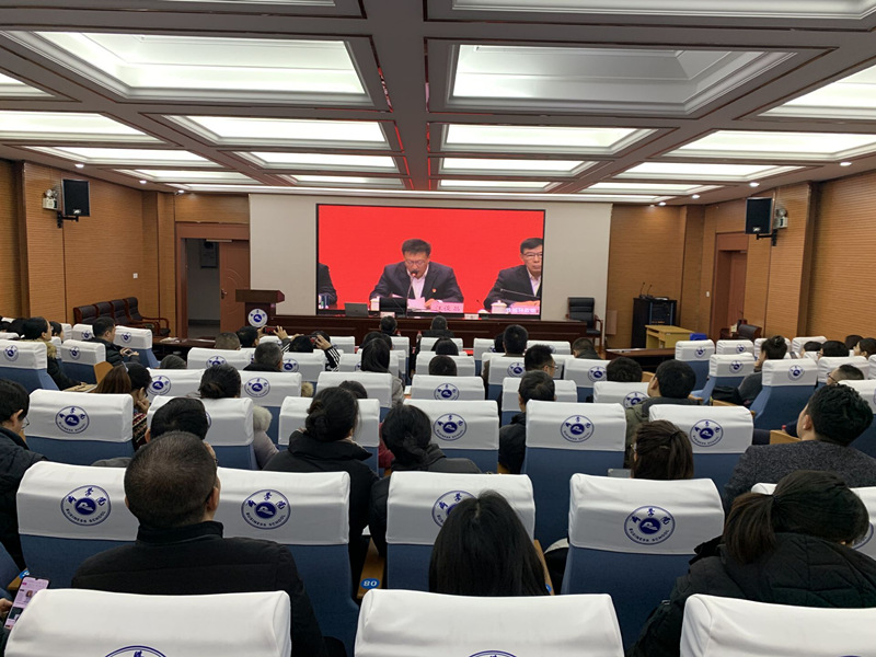 医学院、数理信息学院参会人员在财贞楼二楼报告厅收看会议。