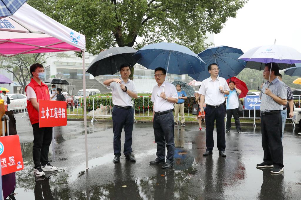 17日上午10点半,王建力一行先后走访河西、南山校区新生测温点、文澜书院和兰亭书法艺术学院。疾风密雨中,不少家长冒雨送孩子入学。“请你们放心,学校会照顾好孩子们,等疫情结束后也请你们再来学校走走看看”,王建力与等候的家长握手、交流,感谢家长对疫情防控工作的理解与支持。王建力指出,迎新不仅要做好新生的服务工作,也要做好家长的接待工作,家长们不远千里把孩子送到学校、托付给学校,是对学校的信任,学校更应该把保障工作做好做足做到位,让学生安心、家长放心。“在大学期间要多向老师请教,全身心投入学习。”在文澜书院新生寝室,王建力询问了新生入住情况,勉励大家要树立成才目标、做好学习规划,开启阳光积极的大学生活。