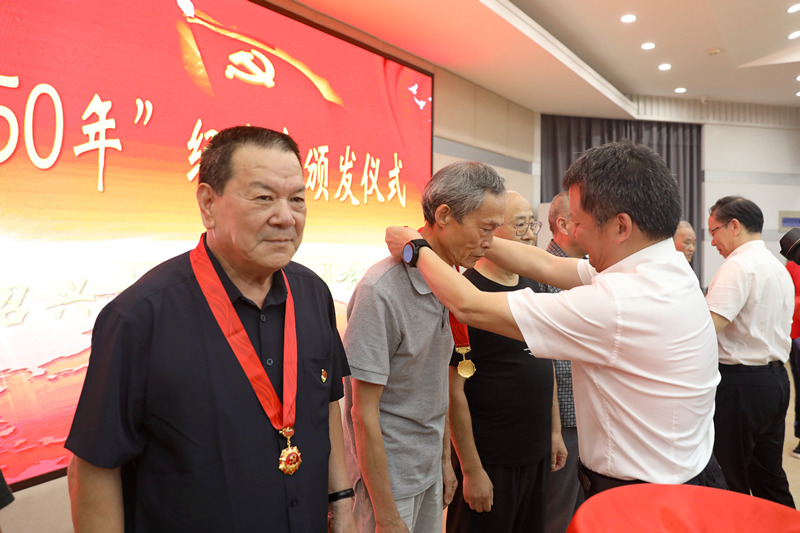 沈赤、宣绍龙为党龄50年以上的党员代表颁发“光荣在党50年”纪念章;学生党员向老党员们献花。