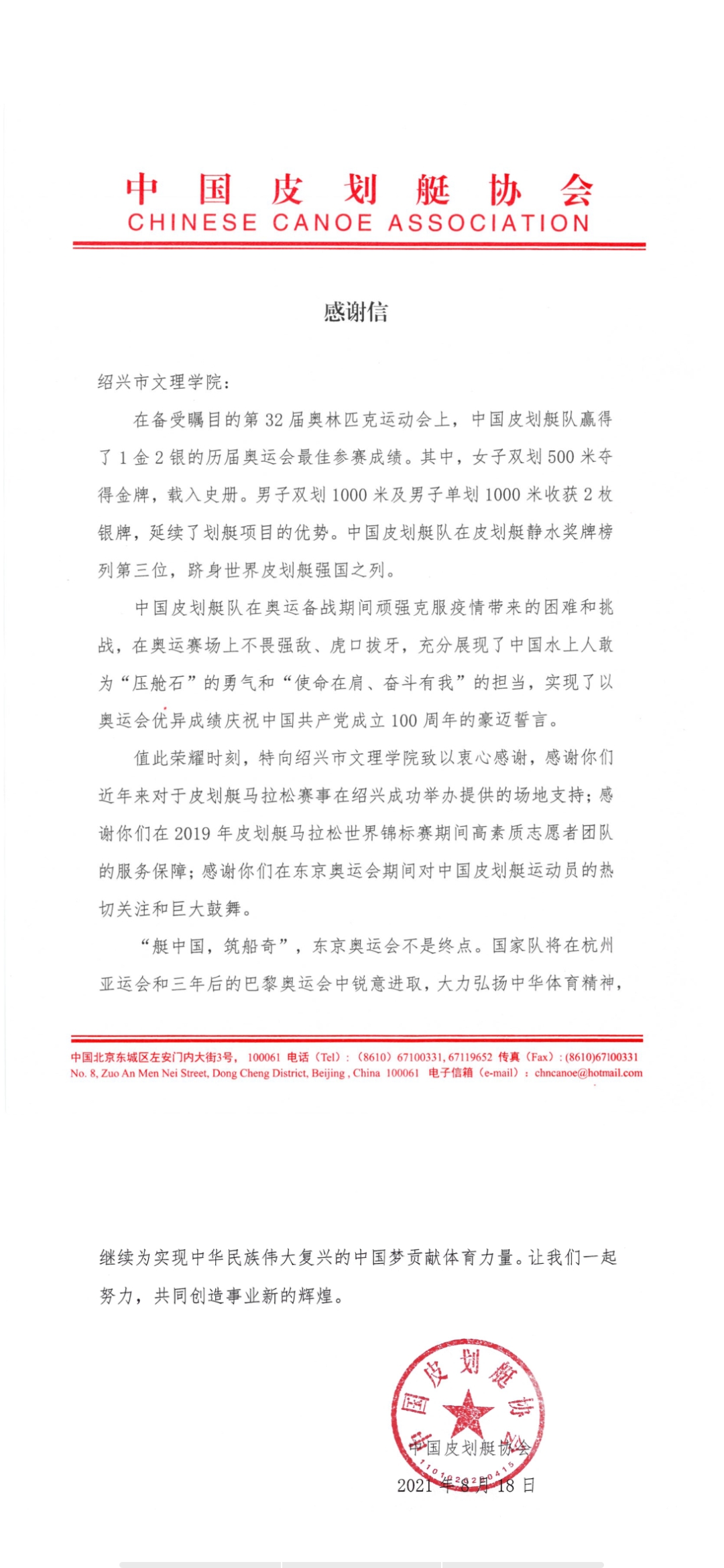 在备受瞩目的第32届奥林匹克运动会上,中国皮划艇队贏得了1金2银的历届奥运会最佳参赛成绩。其中,女子双划500米夺得金牌,载入史册。男子双划1000米及男子单划1000米收获2枚银牌,延续了划艇项目的优势。中国皮划艇队在皮划艇静水奖牌榜列第三位,跻身世界皮划艇强国之列。中国皮划艇协会在感谢信中提到:“值此荣耀时刻,特向绍兴市文理学院致以衷心感谢,感谢你们近年来对于皮划艇马拉松赛事在绍兴成功举办提供的场地支持;感谢你们在2019年皮划艇马拉松世界锦标赛期间高素质志愿者团队的服务保障;感谢你们在东京奥运会期间对中国皮划艇运动员的热切关注和巨大鼓舞。”信中还写到,国家队将在杭州亚运会和三年后的巴黎奥运会中锐意进取,大力弘扬中华体育精神,继续为实现中华民族伟大复兴的中国梦贡献体育力量,希望与我校一起努力,共同创造事业新的辉煌。