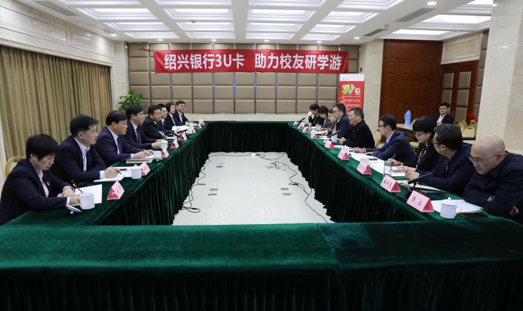 10月26日上午,校“3U卡推广”基金捐赠仪式在铁成科教馆一楼小会议室举行。校党委副书记沈赤,绍兴银行董事长金建康、行长陈军、副行长吴维杠,绍兴文旅集团游客中心主任沈仲茂,学校对外联络处、党委宣传部、教务处、计财处、后勤管理处和人文学院相关负责人等参加会议。