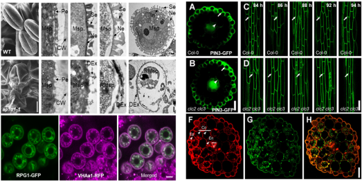 膜蛋白运输(membrane protein trafficking)是当前生命科学研究中的重要前沿热点之一。诺贝尔生理学或医学奖已经先后四次授予从事该研究领域的科学家。网格蛋白介导的内吞CME是质膜内吞的主要途径之一,调控胞外物质吸收、膜蛋白丰度和胞内外信号传递等重要细胞生物学过程。近年来,王超课题组研究人员利用激光共聚焦显微镜等现代分子细胞生物学技术,在模式植物拟南芥中,证明了网格蛋白参与调控植物下胚轴伸长,并发现网格蛋白接头蛋白AP-1复合体在雄配子发育中具有重要的生物学功能。这些阶段性研究成果将为深入剖析植物膜蛋白运输的分子调控机制提供新的见解。