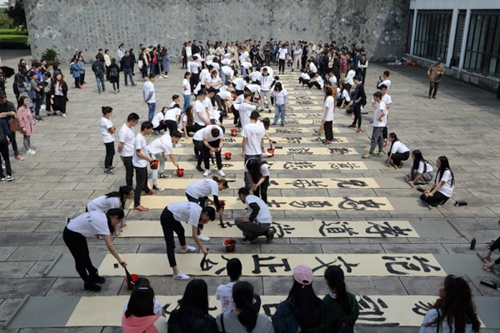 4月12日,阳光明媚,春意盎然,一年一度的“畅写阳春”活动在兰亭书法艺术学院照壁广场举行。兰亭书法艺术学院、学校相关职能部门负责人,兰亭书法艺术学院全体老师和学生,学校学生社团骨干,部分外籍教师和留学生,以及来自瑞士的书法游学团参与书写活动。