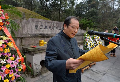 祭祀大典上午9时正式开始,中华孔子学会副会长暨阳明学研究会会长、王阳明研究院院长董平教授担任主祭,我校越文化研究院执行院长、王阳明研究院常务副院长潘承玉教授,浙江国际阳明学研究中心主任、王阳明研究院副院长钱明先生陪祭,稽山书院副院长、王阳明研究院副院长潘建国担任司仪。董平教授恭读祭文,绍兴阳明小学的20多名学生献上祭舞《吾心光明》,董平、潘承玉、钱明等先后向王阳明墓碑献花、上香。王阳明十八代孙王来云、王来芝为先祖献上贡果和鲜花。500多名市民自发赶到现场参加典礼。