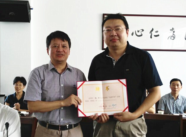 沈赤为陶然教授颁发“鉴湖学者”讲座教授聘书。