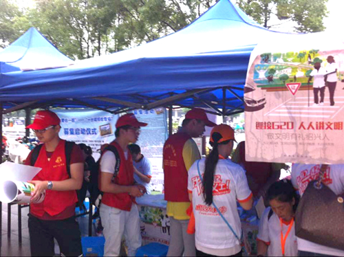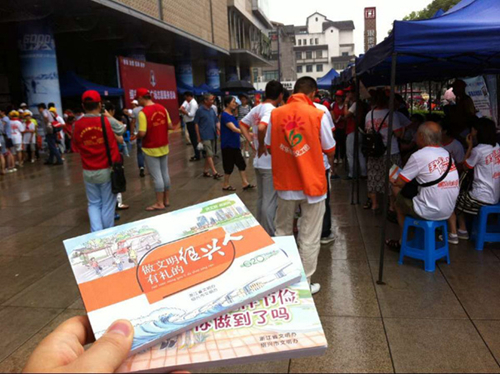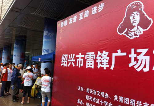 7月16日上午,绍兴市雷锋广场志愿服务活动在位于银泰城的雷锋广场举行了一场大型活动,上百名志愿者顶着大雨准时来到现场。此次活动是由绍兴市文明办、共青团绍兴市委、绍兴市慈善总会、绍兴市红十字会、绍兴市残疾人联合会、越城区文明办主办,我校外国语学院和绍兴文明网承办。
