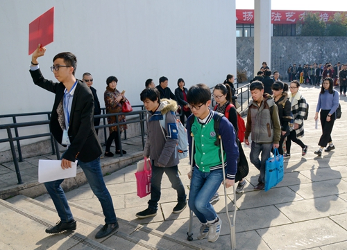 3月3日上午,我校2016年书法学(师范)专业考试开考。来自浙江、江苏、江西、陕西、黑龙江等14个省975名考生聚集在兰亭书法艺术学院“晋唐心印”照壁前,准备进入考场。