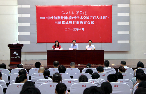 6月24日下午,我校2015学生短期赴国(境)外学术交流(“百人计划”)出征仪式暨行前教育会议在铁城科教馆报告厅隆重召开。校长叶飞帆、校党委副书记唐和祥,相关职能部处负责人,全校二级学院院长、书记、外事分管领导、外事秘书,2015年“百人计划”交流团师生,2015年秋季国际交流项目学生,共300余人参加活动。活动由外事处处长冯燕主持。