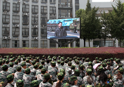 我校组织2014级军训学生集体观看抗战胜利70周年纪念大会直播。借助于文化校园建设新近安装的校园LED电子显示屏等设备,上午9:30操练结束,军训学生以学院为单位,集合到河东鲁迅铜像旁、河西餐厅、南山大门口、南山餐厅、南山综合楼、财贞楼报告厅、元培报告厅、兰亭校区餐厅等处,集中观看抗战胜利70周年纪念大会直播。校党委副书记唐和祥,校党委委员、宣传部部长胡保卫,学工部、保卫处、校团委负责人,各学院学生工作副书记,各连队教官、指导员共同收看这一盛况。