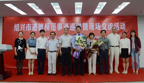 2015年绍兴市道德模范事迹首场巡讲活动于5月13日下午在我校河西校区图书馆一楼报告厅举行。绍兴市委宣传部部务会议成员、市文明办副主任徐人杰,绍兴市文明办城市文明创建处副处长李建华,第三届绍兴市道德模范潘旗龙、郭秀珍,法学院师生代表120余人参加了本次活动,共同感受道德模范事迹带来的正能量。活动还邀请了由我校师生代表组成的宣讲团中的三位同志为大家宣讲。