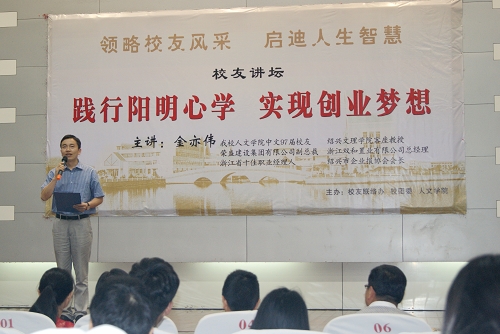 6月9日晚上,我校人文学院中文97届校友荣盛建设集团有限公司副总裁金亦伟在铁城科教馆报告厅作了题为“践行阳明心学,实现创业梦想”的演讲。校友联络办负责人、校外嘉宾以及300余名大学生到场聆听。