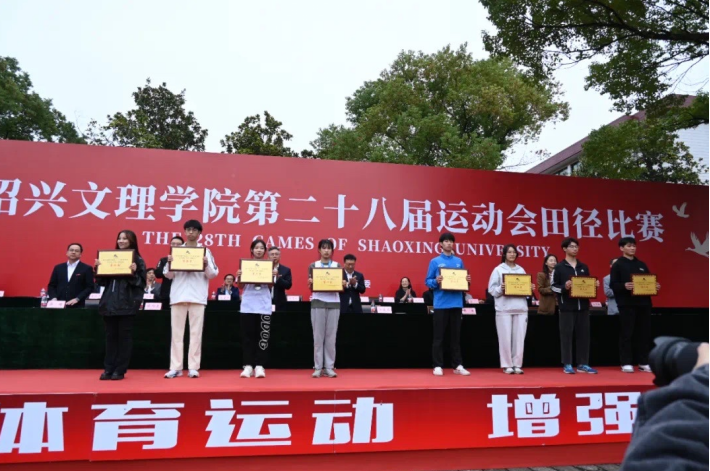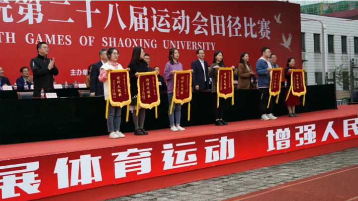 校领导为获奖代表队颁发奖牌。外国语学院、商学院、土木工程学院、数理信息学院、纺织服装学院、马克思主义学院获精神文明奖;数理信息学院分工会、商学院分工会、附属医院分工会、土木工程学院分工会、化学化工学院分工会、艺术学院分工会获教工组团体前六名;体教221班、体教222班、体教212班获学生团体比赛乙组前三名;元培学院、上虞分院、土木工程学院、生命科学学院、机械与电气工程学院、数理信息学院、商学院、医学院获学生团体比赛甲组前八名。