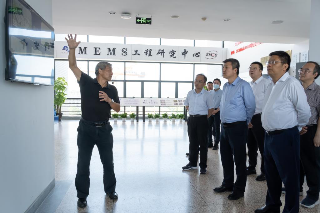 刘育新一行实地走访了我校微机电系统浙江省工程研究中心,踏看了研发场地、制造及检验检测设备,听取了MEMS 973首席科学家、绍芯实验室执行主任、中心负责人王跃林教授的情况介绍,详细了解了中心全力配合绍芯实验室打通研发与量产的“篱笆墙”的有关情况。张维加教授结合本人从事的“基于无损传感的黄酒品质检验检测技术”研究作了成果介绍等。