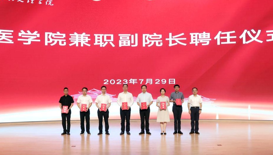 赵阳为医学院兼职副院长方兴亮、赵振华、屠传建、龚月江、杨松斌、姚灿珍、戚坚永颁发聘书。