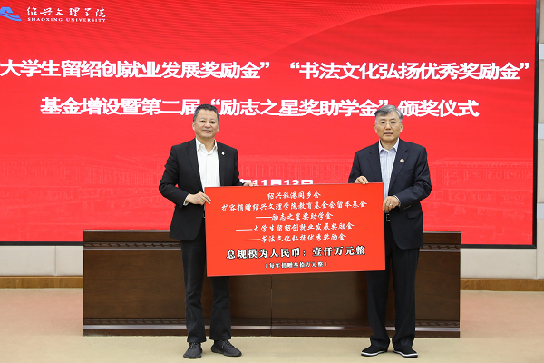 11月13日下午,“大学生留绍创就业发展奖励金”“书法文化弘扬优秀奖励金”基金增设暨第二届“励志之星奖助学金”颁奖仪式在我校图书馆一楼报告厅举行。绍兴市委统战部常务副部长黄浙平、绍兴旅港同乡会会长严建国、绍兴市委统战部港澳台和侨务工作处处长童斌、绍兴旅港同乡会常务副会长毛宇峰,校党委书记汪俊昌、副书记沈赤,校相关职能部处负责人,相关二级学院副书记,第二届“励志之星奖助学金”获奖学生代表等参加仪式。