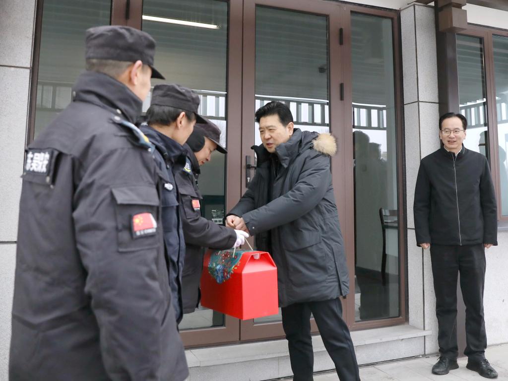 崔凤军一行先后来到学校改扩建专班办公室、河西配电房、河东青藤书院、校警务站、学校正大门、附属医院、兰亭校区,亲切慰问了寒假期间依然坚守岗位认真履职的教职员工,致以诚挚的问候,并代表学校党委行政送上了新春祝福和慰问品。