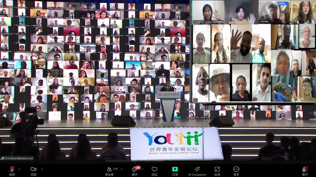 8月12日, 2024年世界青年发展论坛在北京开幕。本届论坛主题为 “青年共建美好未来”,由中华全国青年联合会、联合国驻华系统、世界青年发展论坛组委会共同主办。来自130多个国家和20多个国际组织的2000多名青年代表通过线上线下形式参与了此次活动。我校18名优秀中外学生代表线上参会。