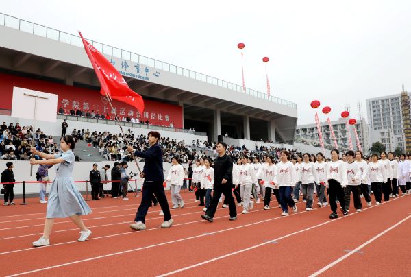 国旗、校旗、运动会会旗方阵,各学院代表方阵,体育教育专业方阵,优秀社团方阵,运动队方阵等依次入场,各方阵运动员们身着统一服装、迈着坚定昂扬的步伐,彰显出自信与活力。本届运动会有24支运动队、780余名运动健儿参加角逐,将产生男、女共计53个运动项目的金牌。