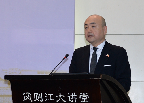 日本驻上海总领事片山和之,日本驻上海领事苅谷桃子,日本驻上海总领馆秘书竹田光希,国会议员秘书江田洋一,日本日中友协协会常务理事大薮二朗,鲁迅文化基金会副会长、绍兴分会会长李露儿,鲁迅文化基金会绍兴分会副会长陆鹰,日本亚洲友好协会理事长徐迪旻,我校校长王建力,副校长寿永明共同出席并聆听讲座。王建力主持讲座。