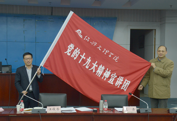 会上成立了党的十九大精神宣讲团。汪俊昌向宣讲团授旗,并对宣讲工作提出要求。他指出,一要旗帜鲜明讲政治,着力在提高政治站位上下功夫。要把讲政治的要求贯穿到宣讲工作始终,在宣讲团组建、调研备课、现场宣讲各个环节,都要坚持正确政治方向。二要融会贯通学原文,着力在全面准确深入上下功夫。宣讲团成员要学懂弄通十九大精神,多思多想,切实把握和领会党的十九大的精神实质和核心要义。三要全面系统全覆盖,着力在提高宣讲感染力和实效性上下功夫。宣讲团要原原本本讲、联系实际讲、针对问题讲,通过全面系统深入宣讲,确保将党的十九大精神传达到每一位师生。