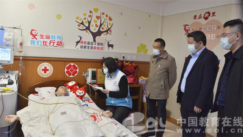 4月4日,学校相关领导和老师都来到了浙江金华,陪潘同学一起完成造血干细胞的捐献。在老师、家人和志愿者们的陪伴下,潘同学走进采样室,完成了造血干细胞的采集,为一个家庭带去延续生命的希望。