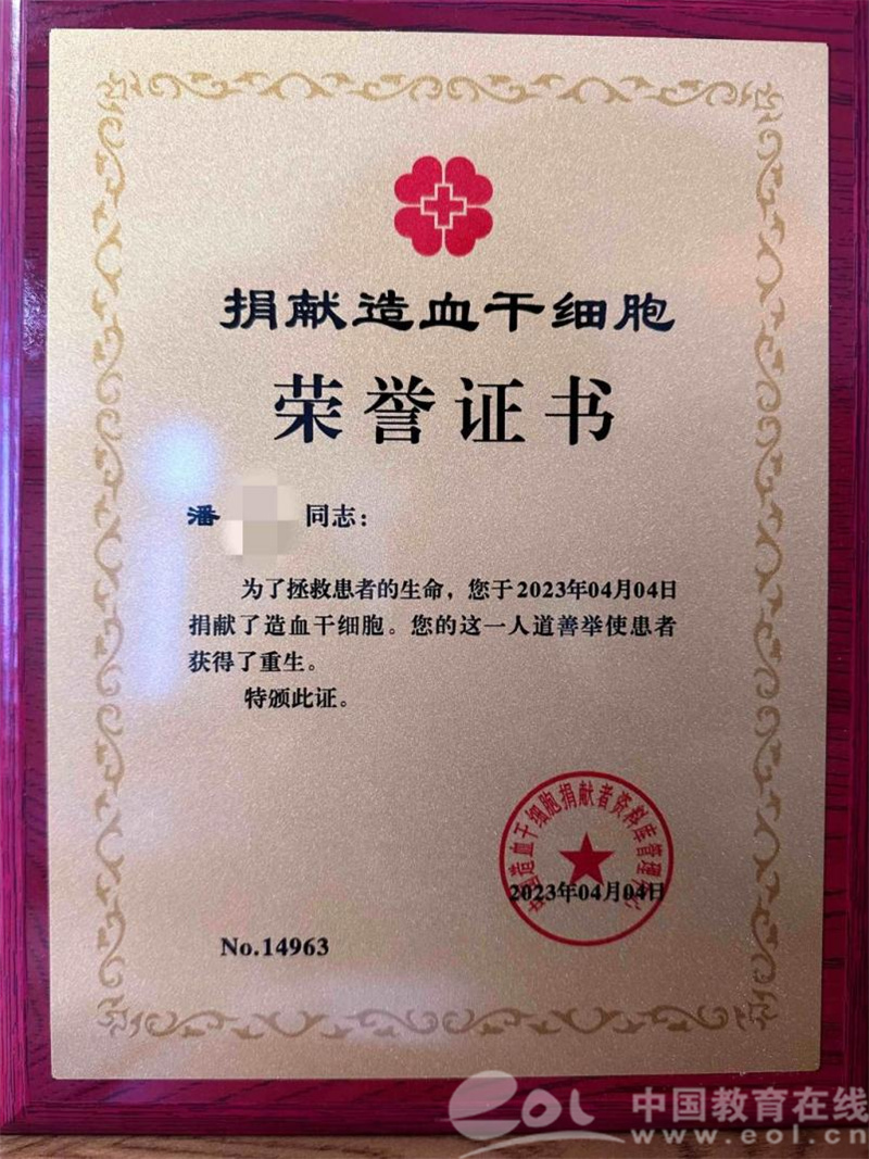 “潘同学是一个很热心公益的同学,他经常参加学校里一些公益活动。2022年还获得了绍兴市无偿献血积极分子的荣誉。”化学化工学院学生科老师介绍,“潘同学积极献血的行为深深感染了身边的同学,所在班级参与献血的已有9位同学。”“这次了解了潘同学的捐献过程,我也在中华骨髓库登记入库,希望也能为有需要的患者匹配上,为他们提供帮助。”潘同学的同窗杨同学说。