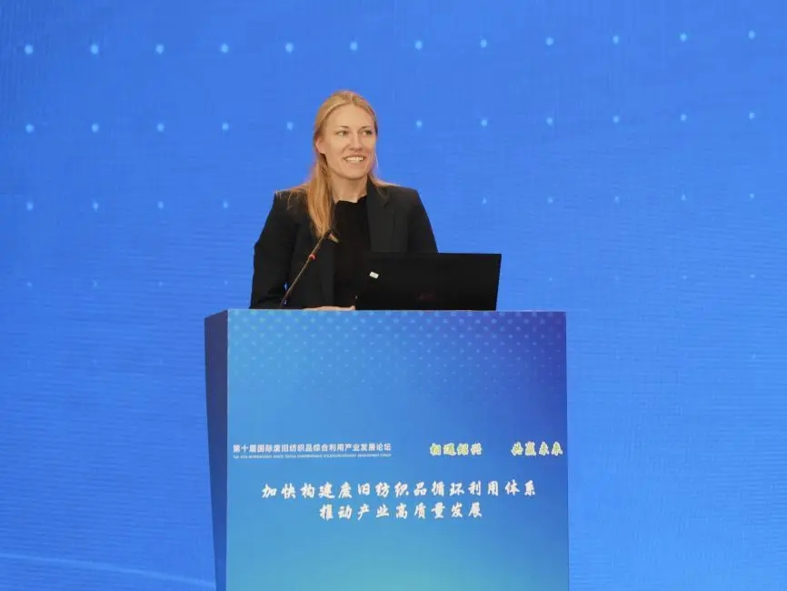 Linn Engvall在致辞中介绍瑞典向循环经济转型的国家战略,途径是采用更多的可循环的生产、消费和商业模式,指出了全球纺织工业碳排放量现状,并表明瑞典政府即将实施回收废旧纺织品的规定,还介绍了瑞典创新公司开发的废旧纺织品分捡和回收技术。