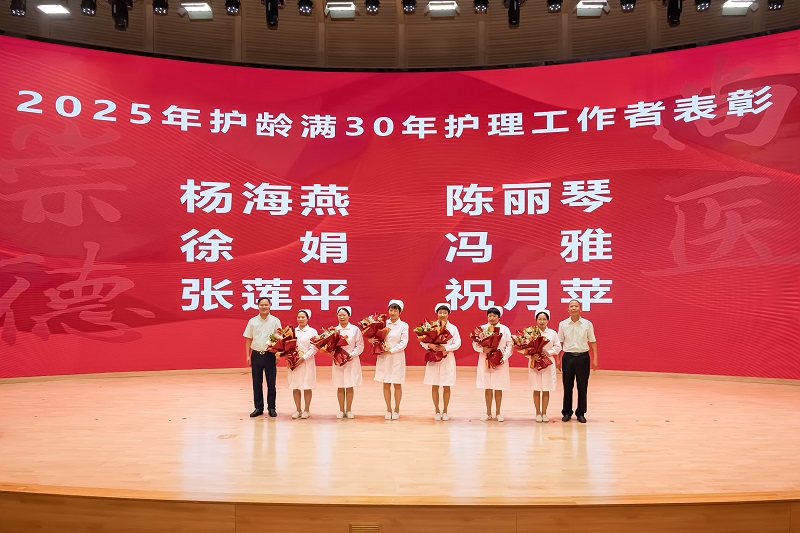 校附属医院副院长、党委委员徐永根宣读护龄满三十年护理工作者表彰名单。夏瑞明和吴剑平为护理前辈们赠送鲜花。