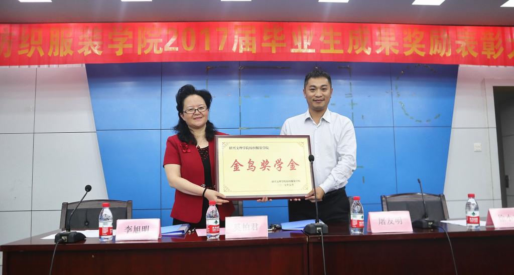 5月25日下午,我校纺织服装学院毕业生学习成果奖励表彰大会在图书馆报告厅隆重举行。宁波金鸟服饰有限公司董事长,我校98届服装专业校友詹行峰委托公司总经理屠友明出席会议,并代表公司为“金鸟奖学金”授予仪式揭牌。
