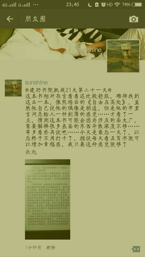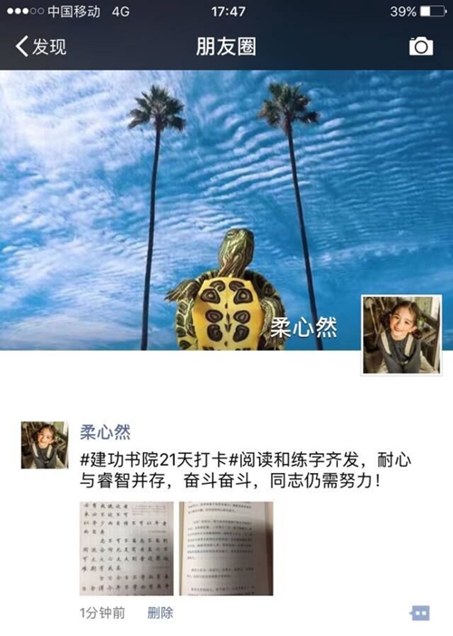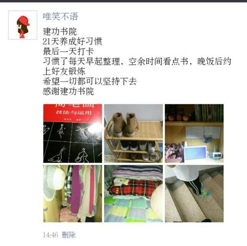 21天,是一个人行为习惯养成的周期。建功书院通过此活动旨在培养学子良好的生活习惯、学习习惯、文明行为习惯,切实提高同学们的文明素养;与此同时,一些老师的参与,可以增进师生间的了解,促进师生情谊。据悉,书院还将通过线下活动,畅谈21天以来的体会和心得,巩固21天成果。