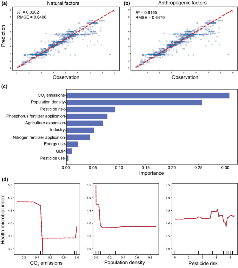 团队首次对受农药污染的土壤微生物群落健康状况进行了全面分析,结果显示农田的健康-微生物指数相对较低,表明农田的生态功能可能存在失衡(图1)。对微生物负面影响最大的前三因素中,农药风险对农田健康-微生物指数的影响位居第二,仅次于二氧化碳排放和人口密度。因此,农田中广泛使用和高浓度的农药是导致农田健康-微生物指数下降的主要原因(图2)。然而,仅了解农药对健康-微生物指数的单独影响是不够的,因为多个因素可能同时土壤微生物健康。团队分析了农药与人为因素之间的相互作用,研究结果表明,农药会与多种因素协同作用加剧农药对健康-微生物指数的负面影响(图3)。团队构建了一个基于机器学习模型,评估农药及其他人为因素对土壤健康-微生物指数的影响。模型预测显示,即便在可持续发展情景下,2015年至2040年期间,全球约26%的农田土壤健康-微生物指数仍可能下降(图4)。换言之,即使通过减少农药使用和推动社会可持续发展的策略,人类仍难以完全遏制土壤微生物群落健康的恶化。团队研究结果强调,要在全球范围内维持土壤微生物群落的健康,不仅需要优化农药管理,还需应对更广泛的人为干扰因素。